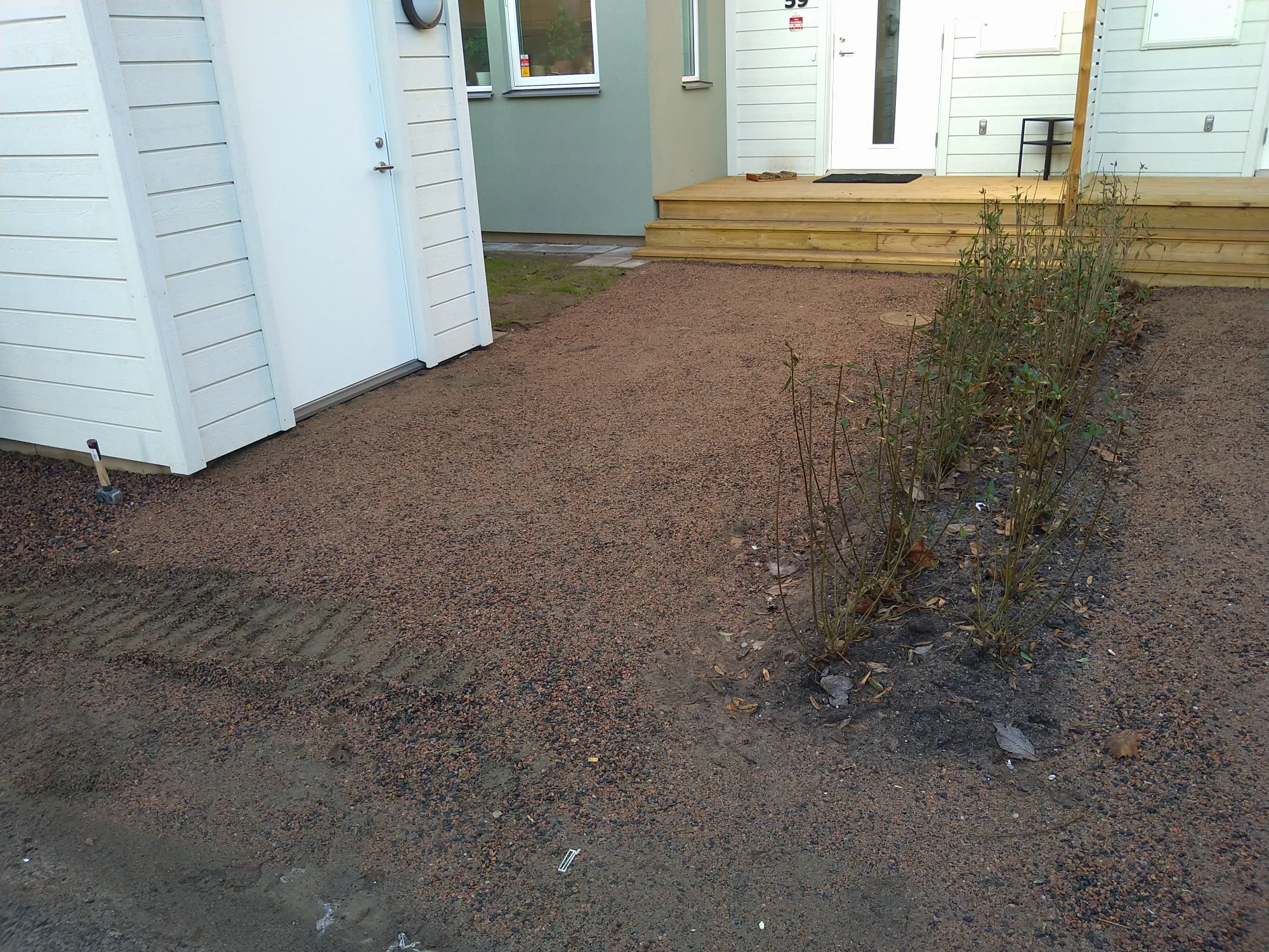 Stensättning av granitkeramik, montering av postlåda, anläggning av rabatt kantsten, plantering samt anläggning av trappa