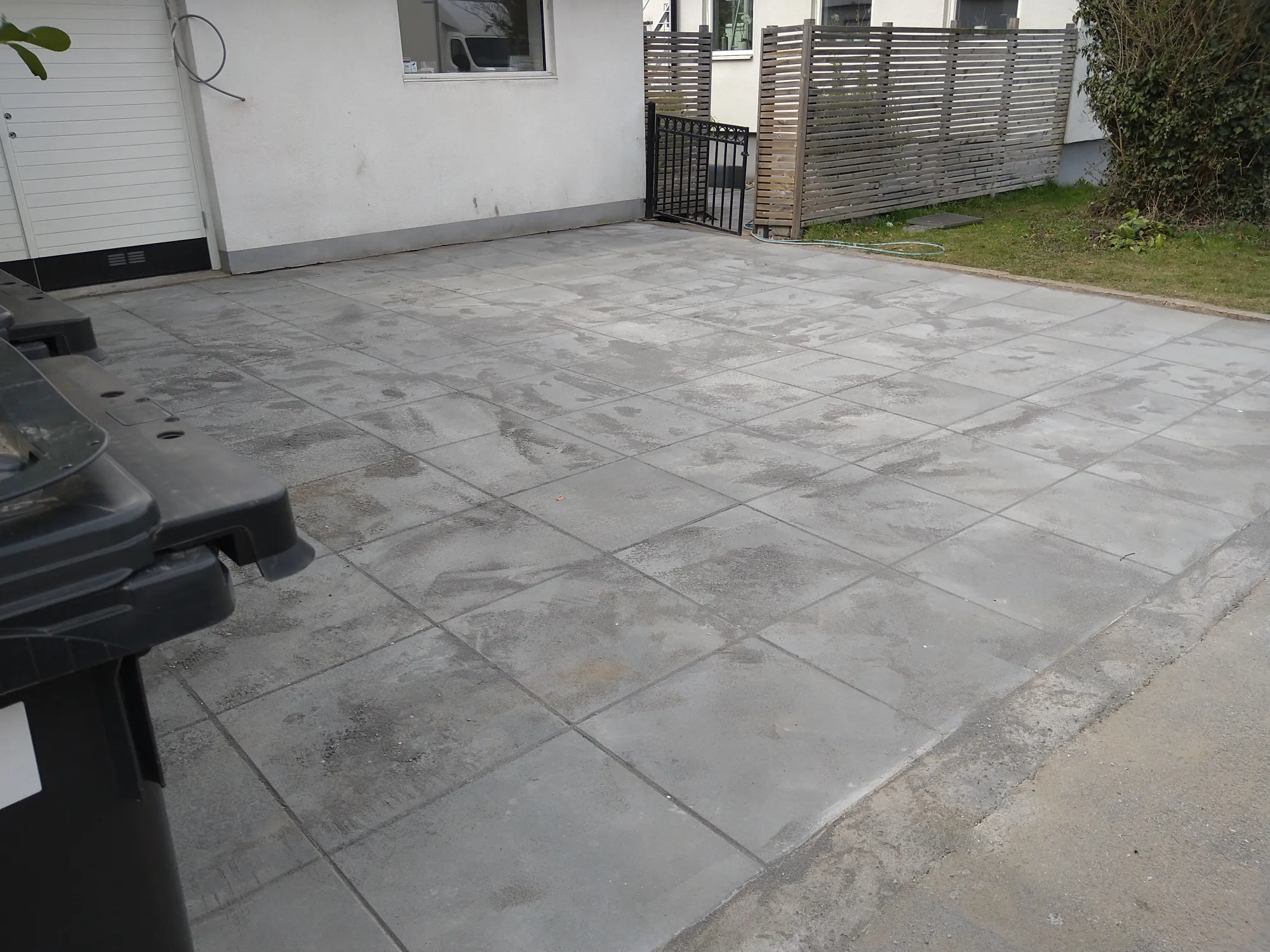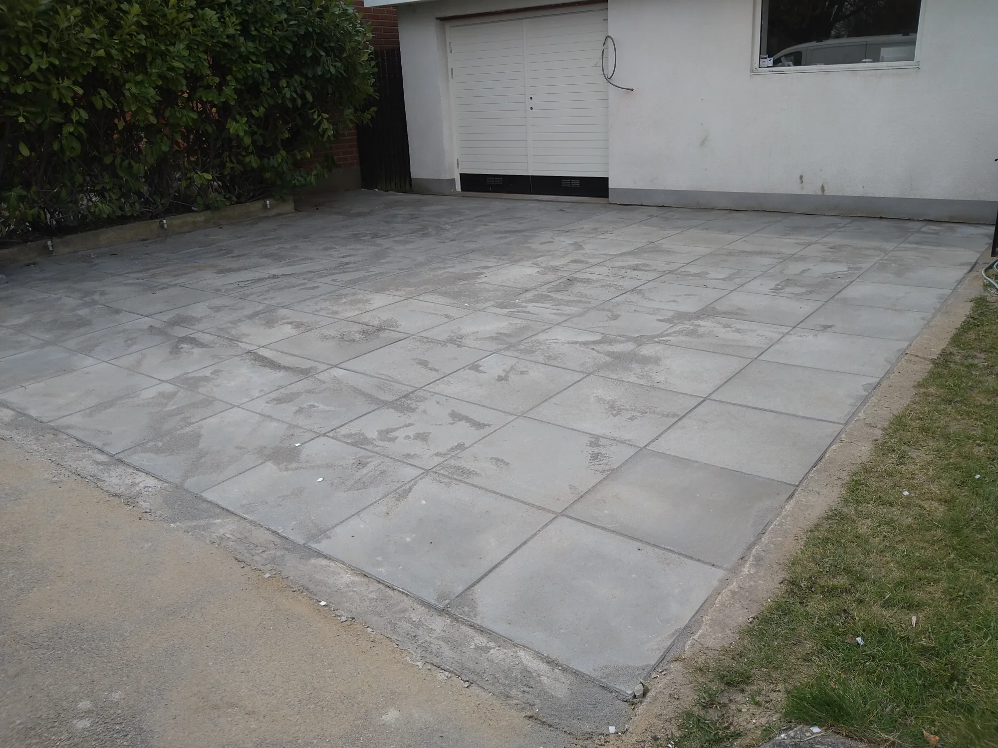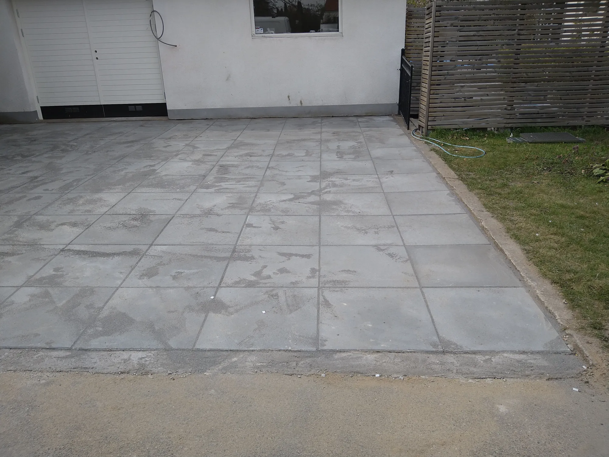 Kunden ville en terrass och uppfart gjort med plattor i Sand grafit
