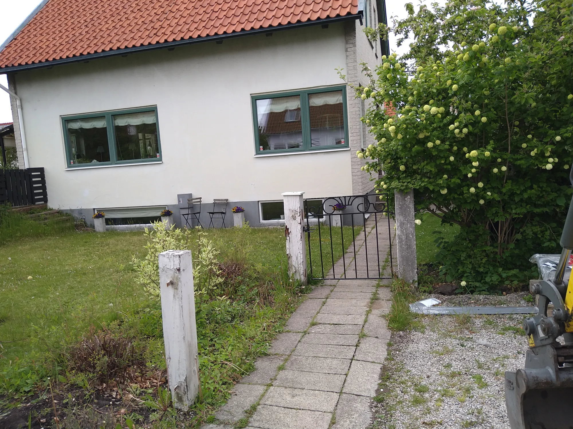 Hel anläggning av trädgård med singel och Corten stålkant. Granit stolpar och montering av grind. skiffer for gång, och gatsten for soptunner