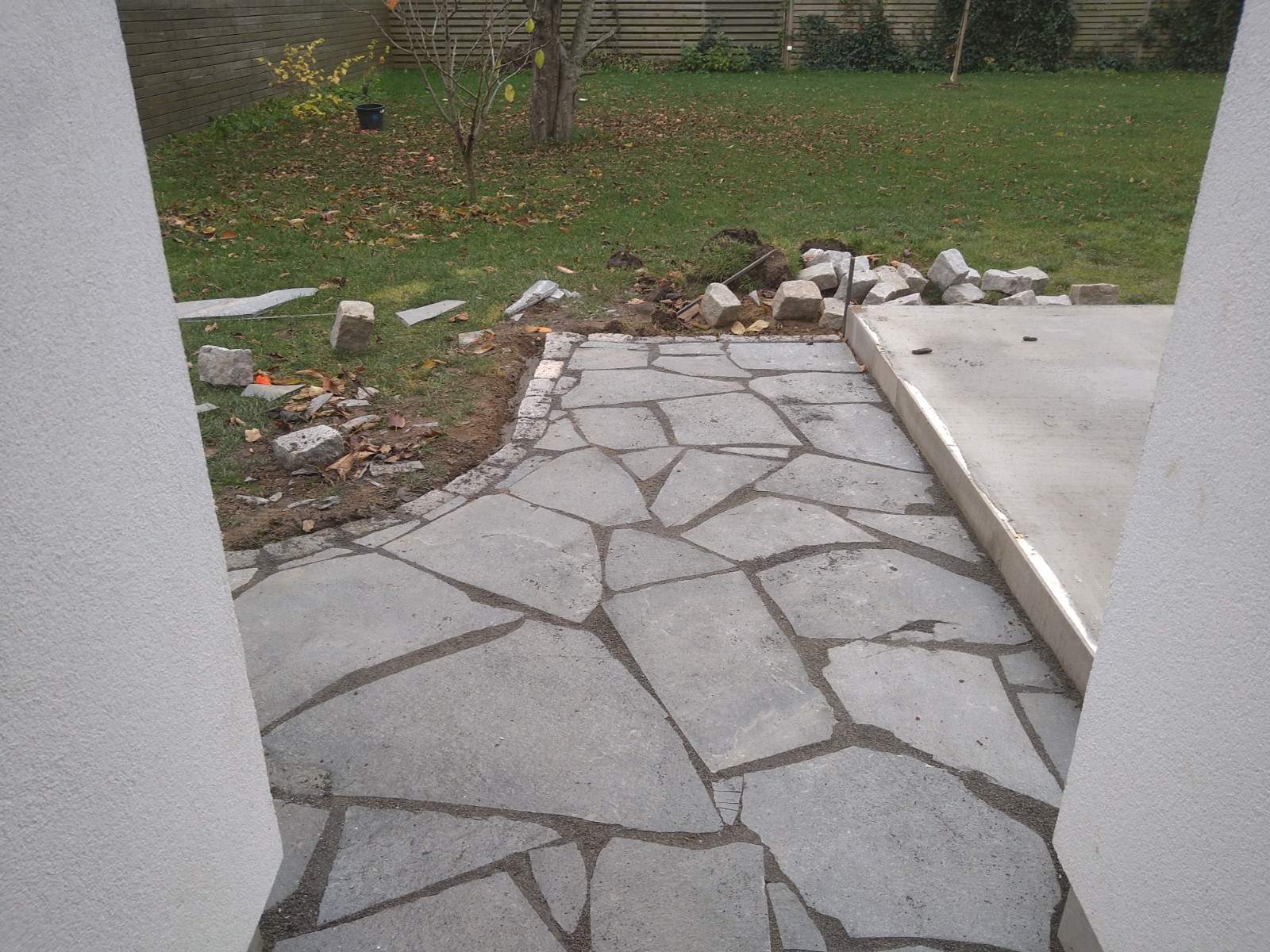 Stensättning av plattor i asymmetrisk design i olika storlekar samt mursättning